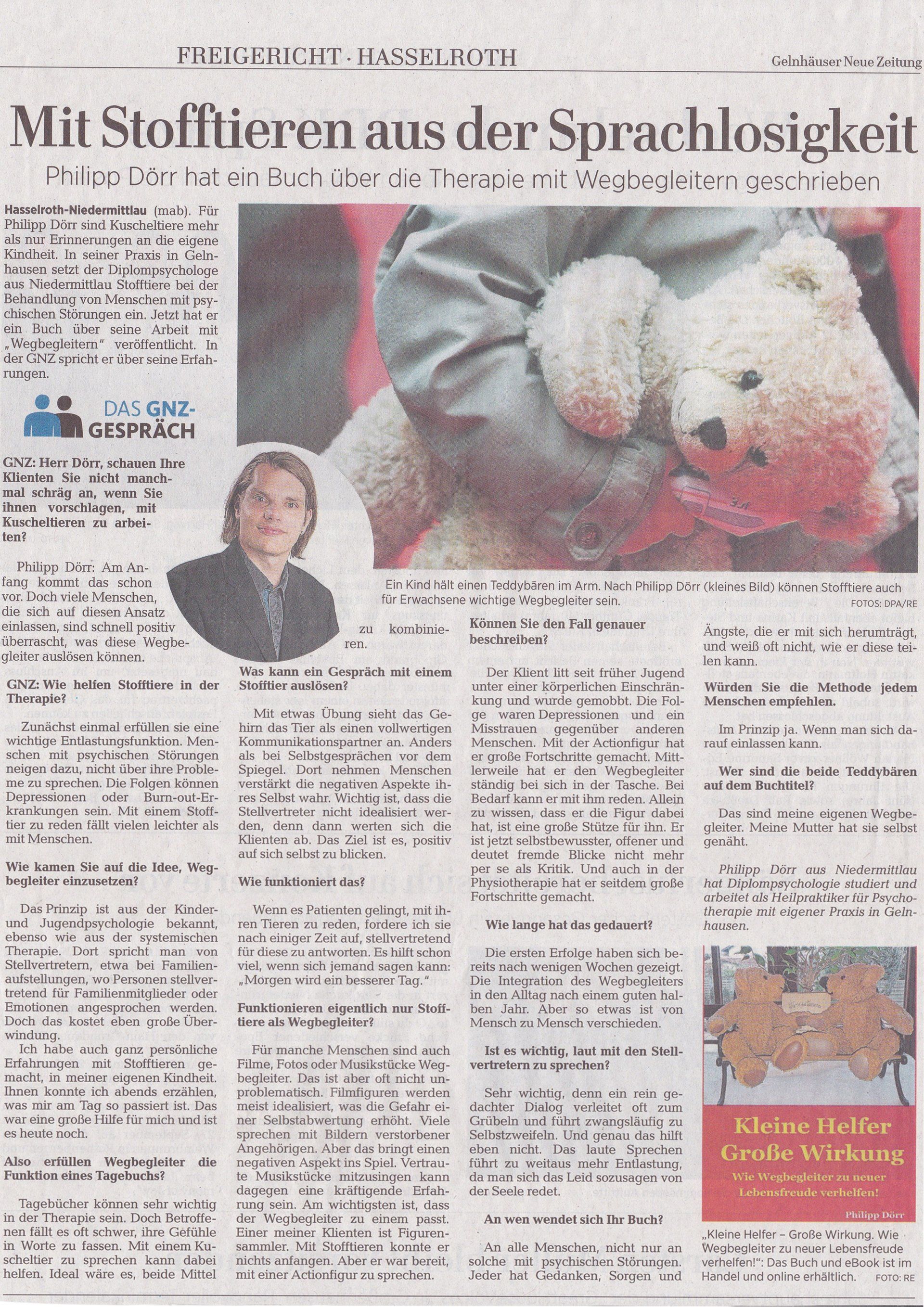 Der Artikel von der Gelnhäuser Neuen Zeitung (Ausgabe 18.11.2017) liefert einen sehr schönen Überblick über meine Person und der Praxis. Vor allem aber zeigt er sehr schön den Weg von den eigenen Erfahrungen zum Buch und schließlich zur Umsetzung des Traums der Selbstständigkeit!